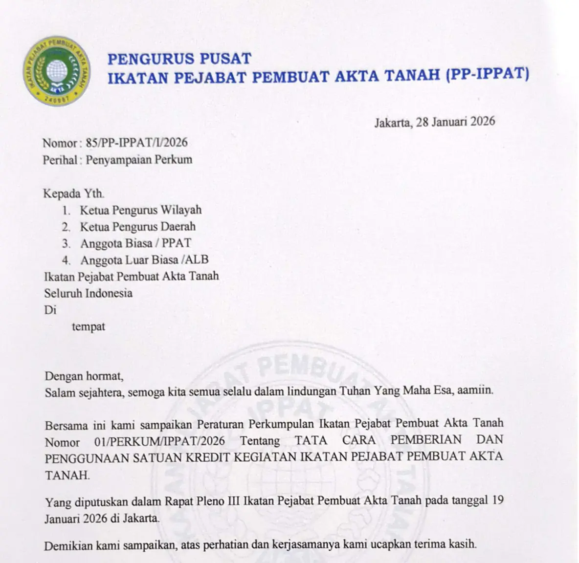 PENYAMPAIAN PERATURAN PERKUMPULAN IPPAT NOMOR : 01/PERKUM/IPPAT/2026 TENTANG TATA CARA PEMBERIAN DAN PENGGUANAAN SATUAN KREDIT KEGIATAN IPPAT