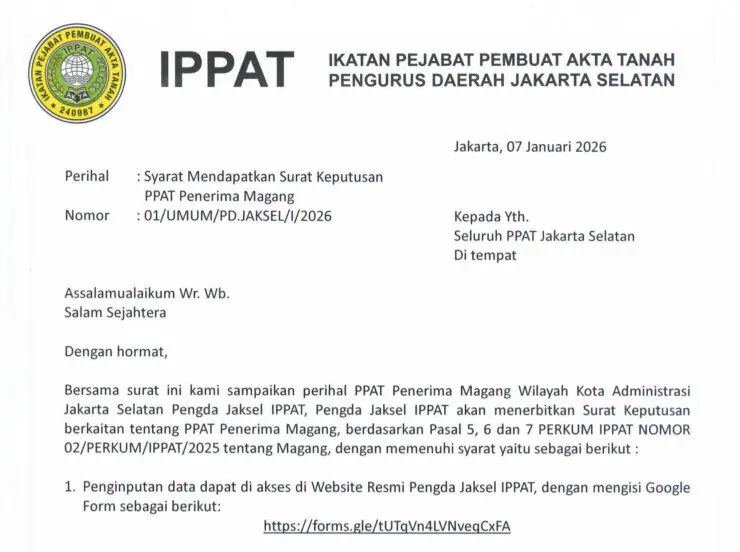 JAKARTA – Pengurus Daerah Jakarta Selatan Ikatan Pejabat Pembuat Akta Tanah (Pengda Jaksel IPPAT) resmi menyampaikan ketentuan dan persyaratan bagi Pejabat Pembuat Akta Tanah (PPAT) di wilayah Jakarta Selatan yang ingin mendapatkan Surat Keputusan (SK) sebagai PPAT Penerima Magang.